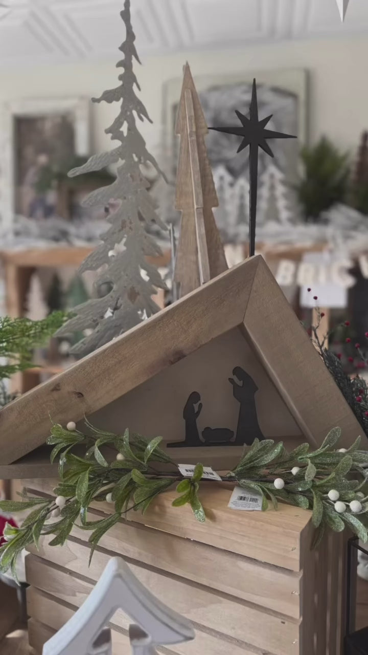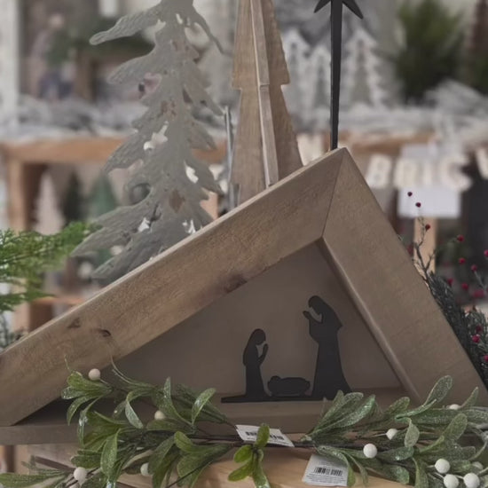Spectacular Christmas Nativity made of thick, substantial barnwood in a natural brown hue, with black stained wood Mary, Joseph, Jesus and Star of Bethlehem on top. This is a simple, elegant, and impactful piece that is meant to make a statement on a mantle, hearth, or console table.