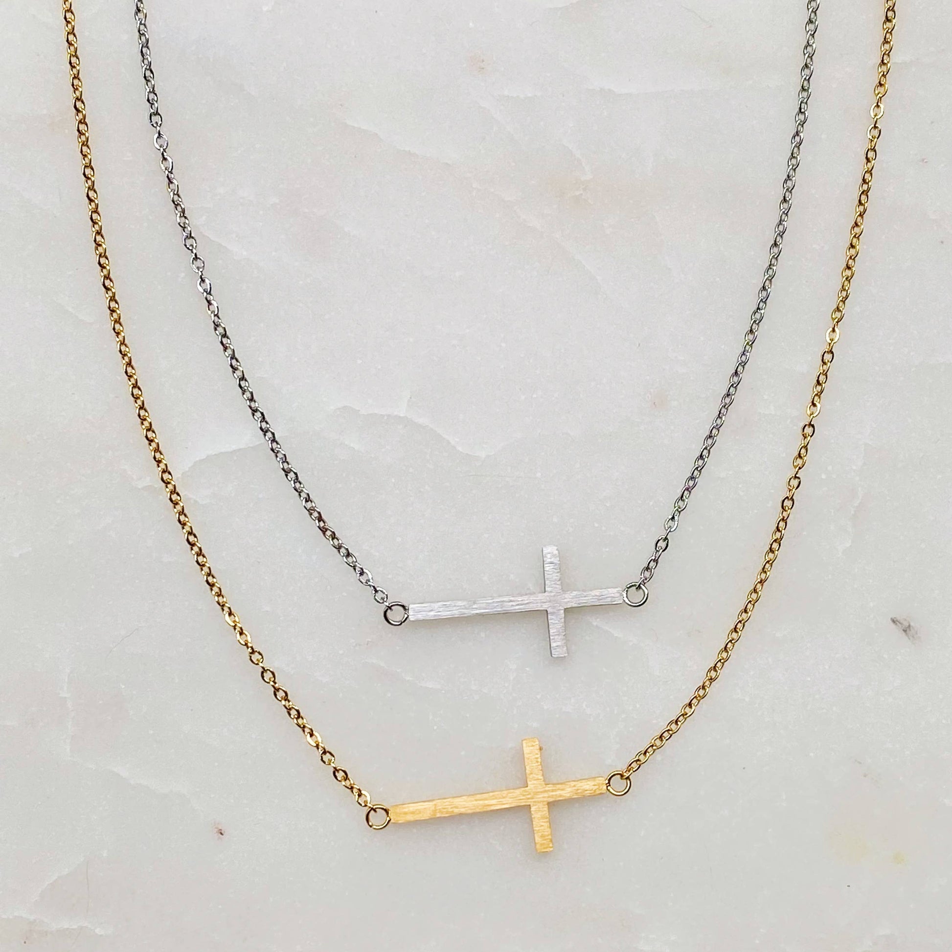 Side hanging cross necklace. The beauty of this necklace is the simplicity. Clean and simple design of side hanging cross looks so understated and edgy! Great to make layers with different necklaces you already own!