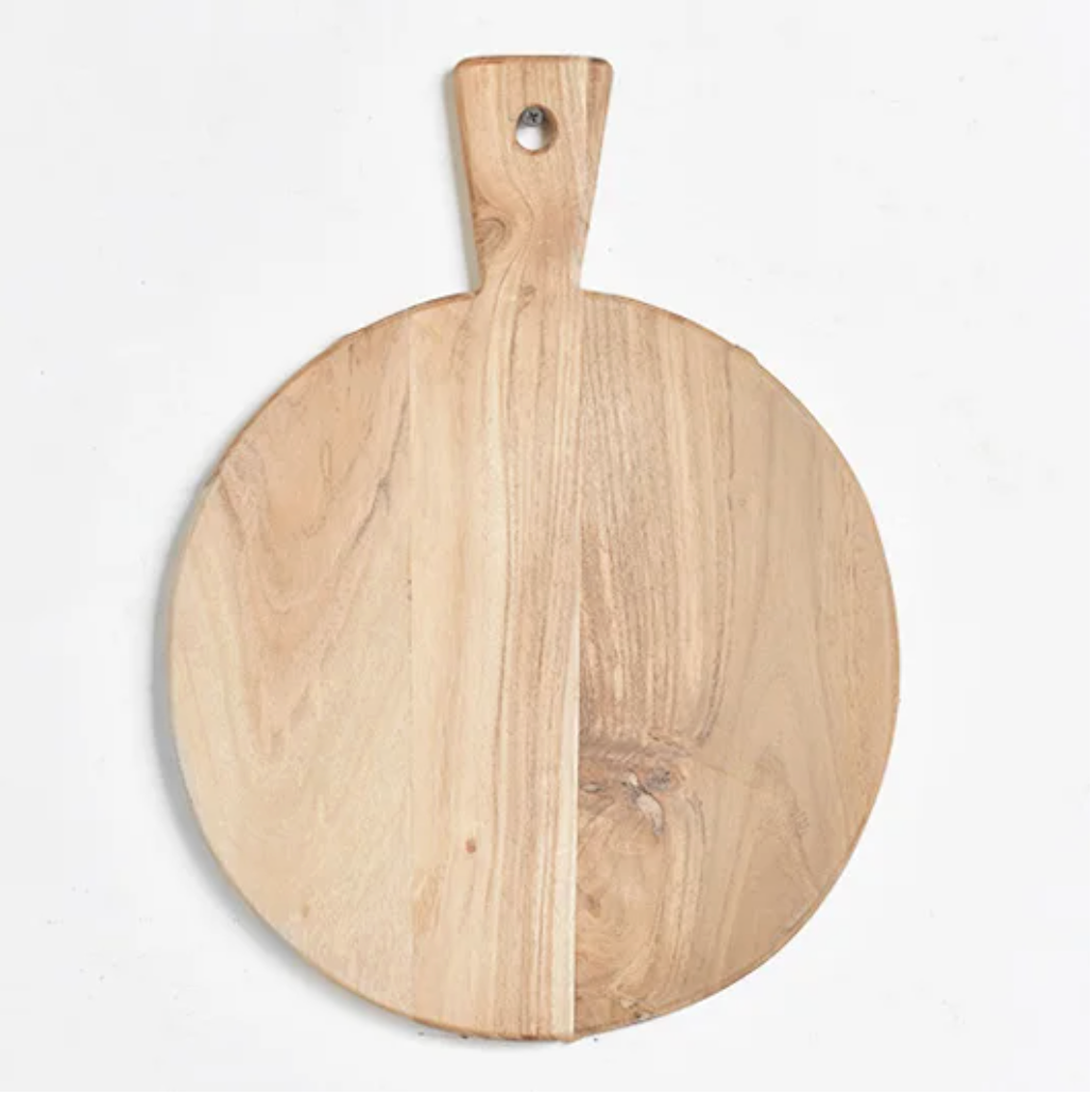This 15.5in Wood Charcuterie Board has a handle with hole to use twine for easy hanging display. Nice brown wood tones.