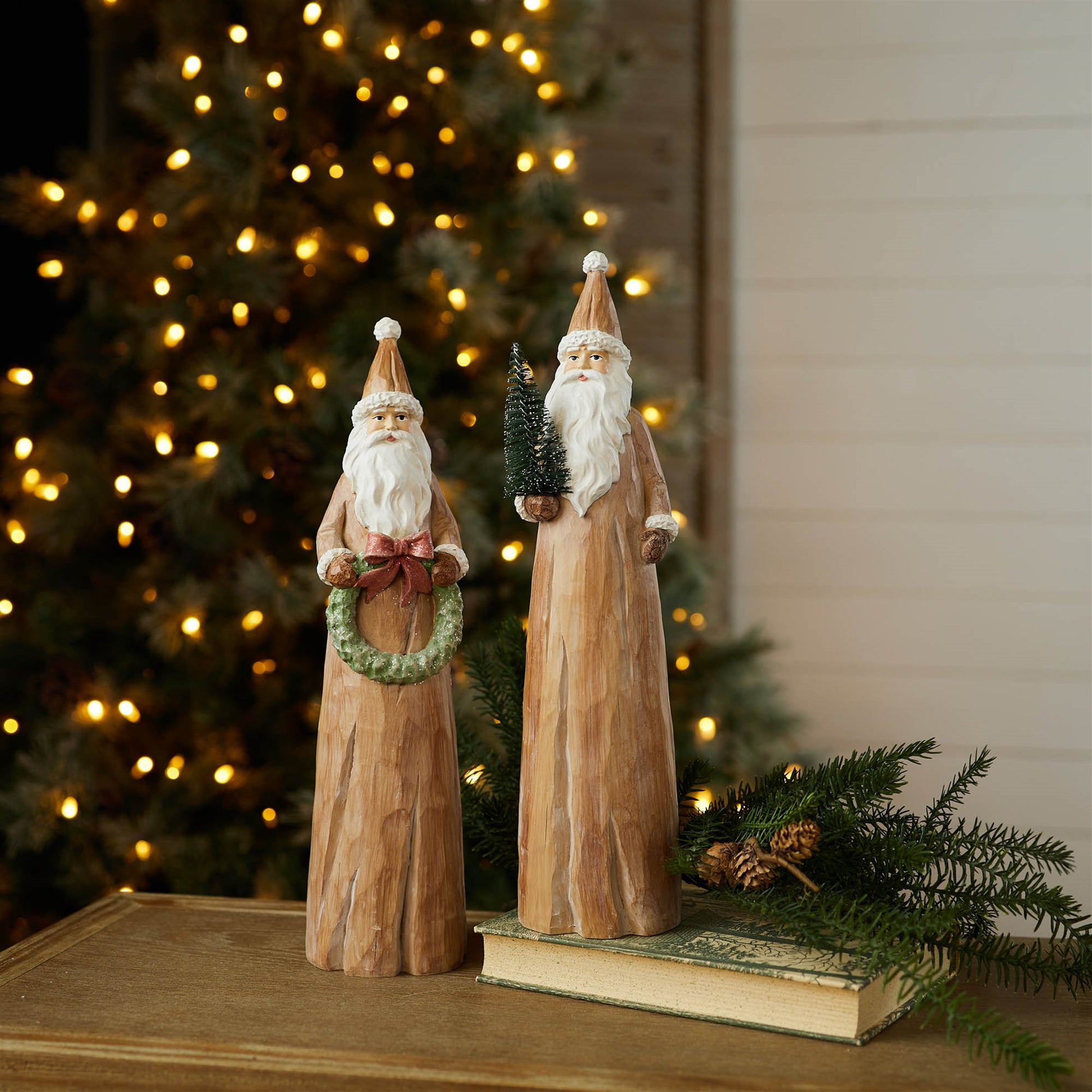 Bring festive charm to your holiday décor with these rustic brown resin Santa figurines. One Santa carries a wreath, while the other holds a tree, adding a warm, handcrafted feel to any space. Perfect for mantelpieces or tabletops, these figurines evoke cozy holiday spirit and timeless tradition.